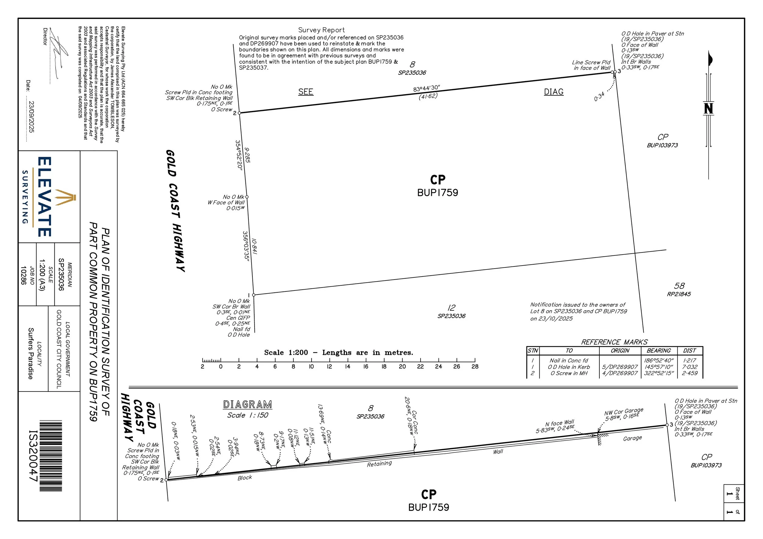 Identification survey carried out to precisely locate and mark the property boundary, confirming the position of an existing retaining wall relative to the boundary line. A clear example of how a registered cadastral surveyor provides certainty in high-density areas.